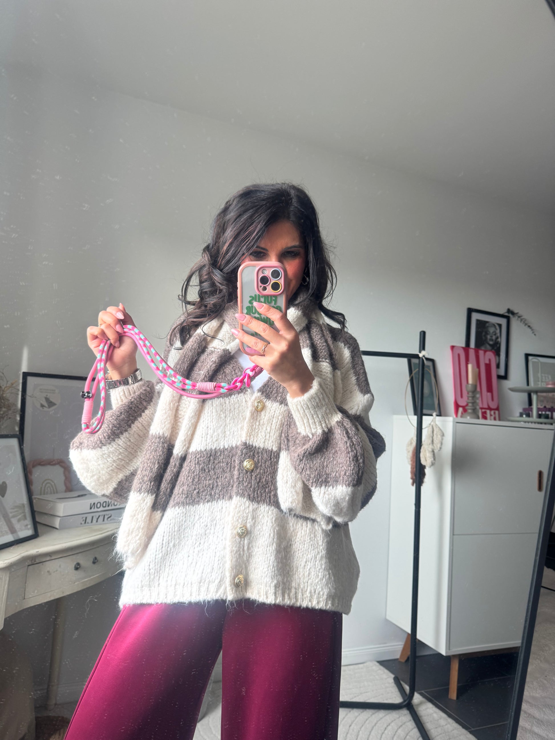 kuschliger cardigan mit breiten beige-creme streifen. weiches, leicht flauschiges material mit entspanntem, leicht oversized schnitt. goldfarbene knöpfe als detail. fällt locker über die schultern und sorgt für einen lässigen cozy look. passt perfekt zu jeans, leggings oder weiten hosen✨