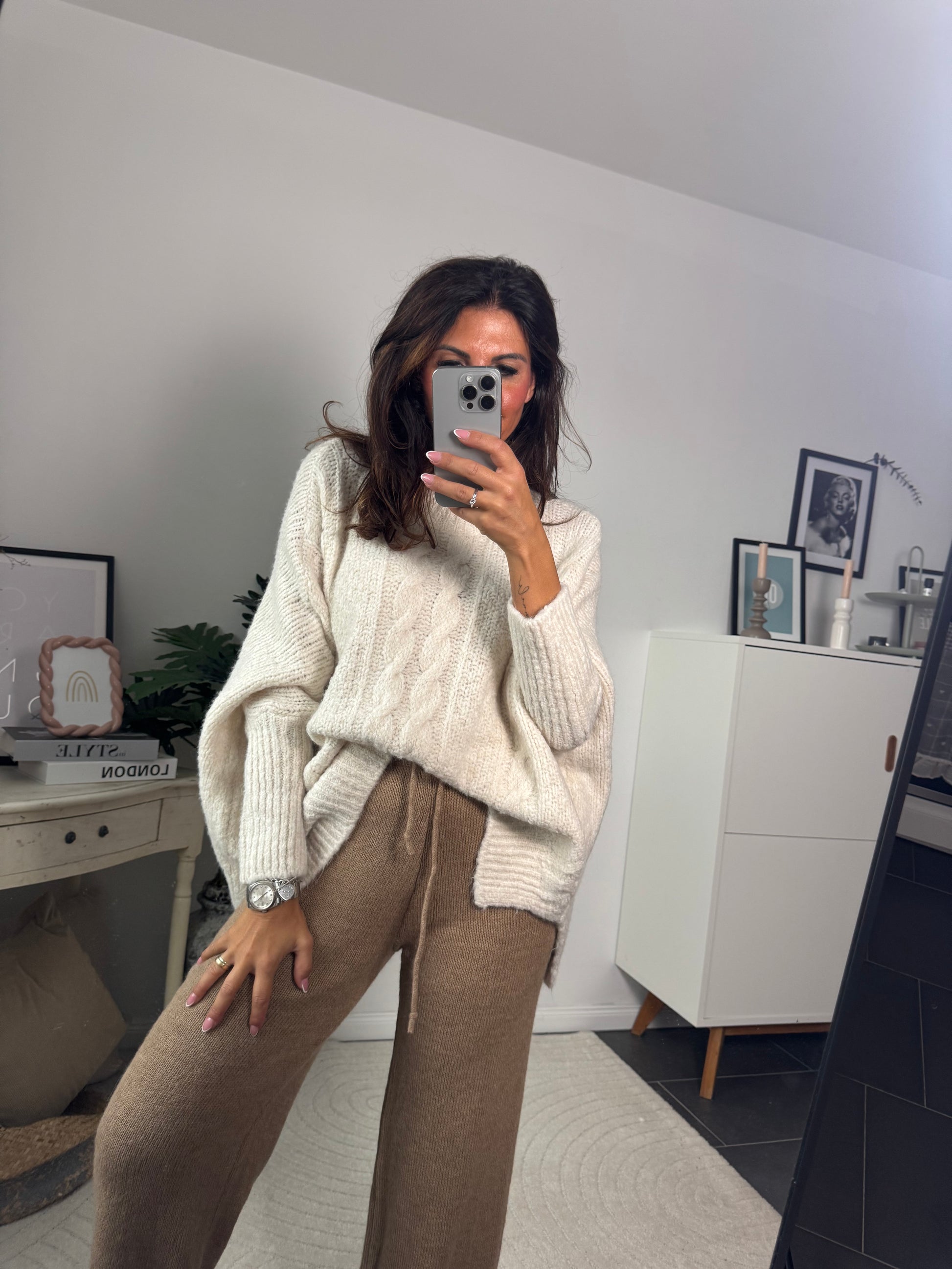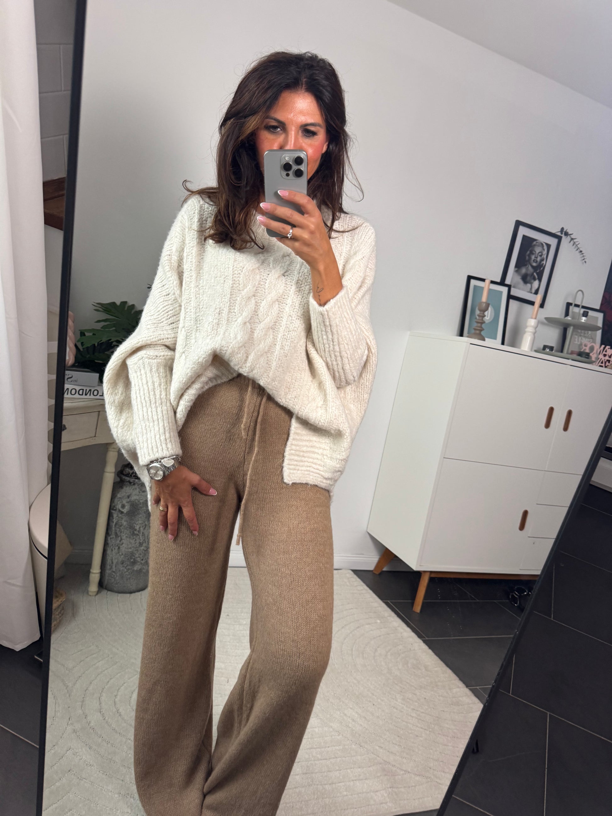 Die Hose ist eine lockere Strickhose in warmem Beige. Sie hat einen geraden, weiten Schnitt und wirkt sehr gemütlich und gleichzeitig stilvoll – perfekt für einen entspannten Alltagslook oder kombiniert als edles Loungewear-Teil✨