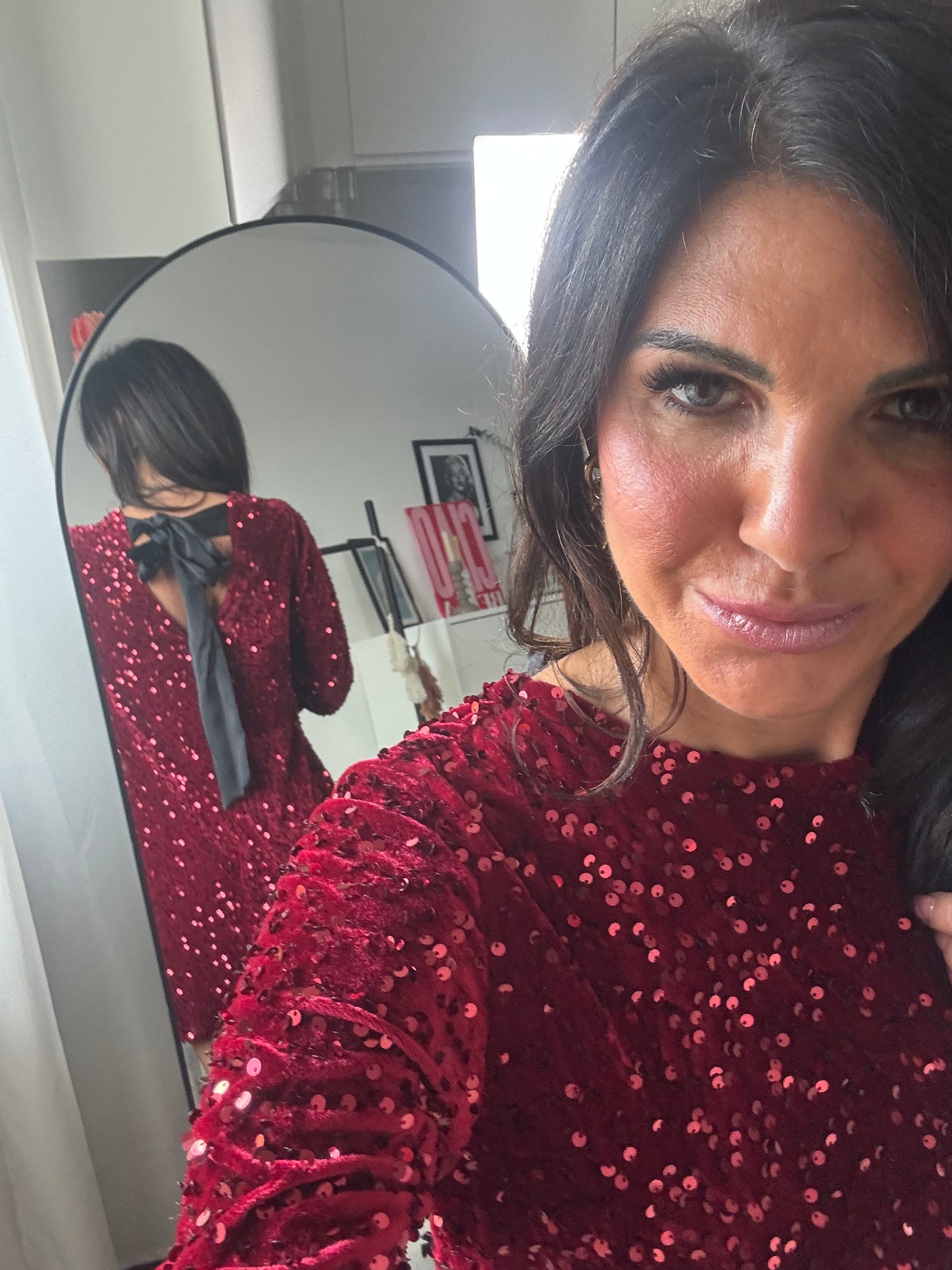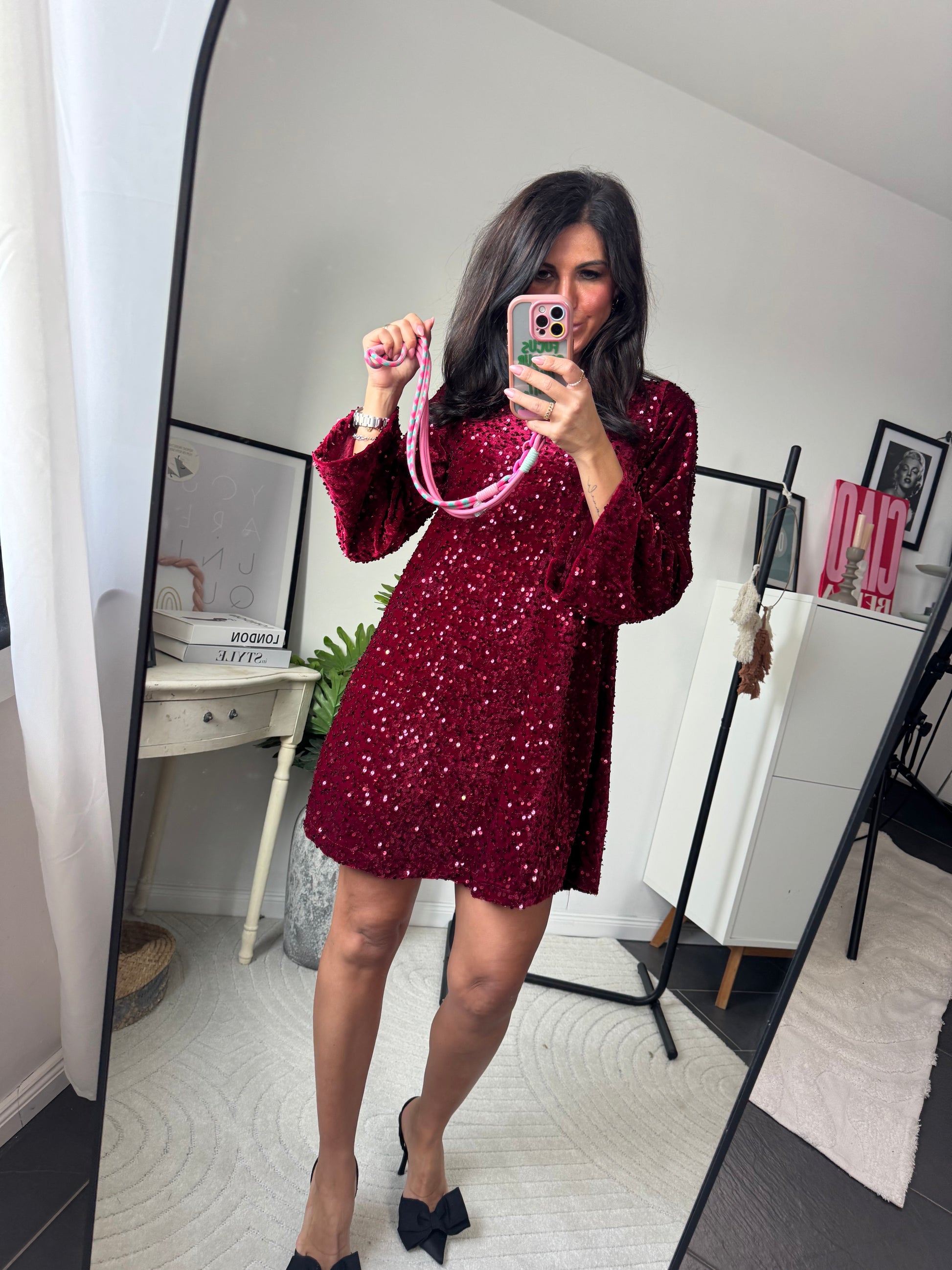 Das Kleid ist ein funkelndes, weinrotes Pailletten-Kleid mit leicht ausgestelltem Schnitt. Die Ärmel sind locker fallend und geben dem Look etwas Elegantes und Verspieltes. Der Stoff ist komplett mit kleinen Pailletten besetzt, wodurch du bei jeder Bewegung strahlst. Hinten hat das Kleid ein schönes Schleifen-Detail, das den Rücken betont und das Ganze noch festlicher macht. Perfekt für Weihnachten, Silvester oder jede Party, bei der du leuchten willst✨