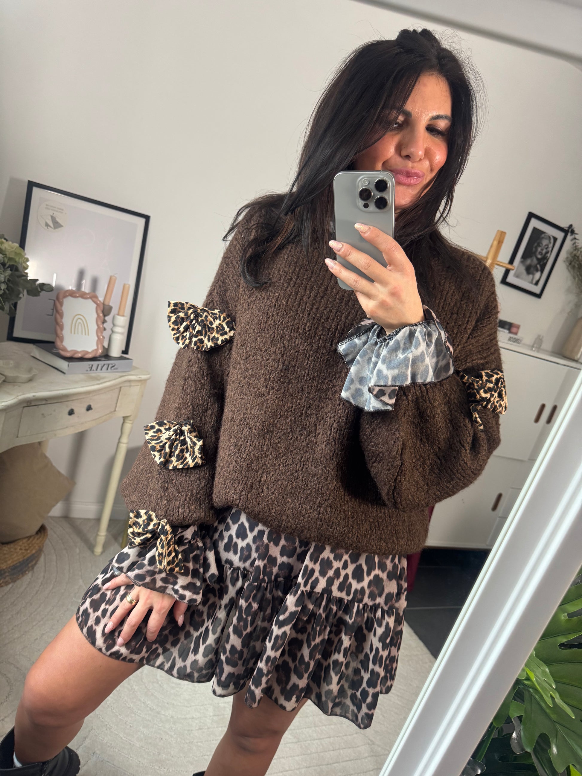Fließendes Kleid mit angesagtem Leo-Print in warmen Braun- und Beigetönen. Locker geschnitten mit leicht taillierter Passform durch die hohe Naht unter der Brust. Der Rock fällt in Stufen und sorgt für eine schöne Bewegung. Lange Ärmel mit elastischem Abschluss und kleinem Volant machen den Look feminin und verspielt. Angenehm leichtes Material, super bequem und perfekt für Alltag, Dinner oder lässig mit Boots gestylt✨🐆