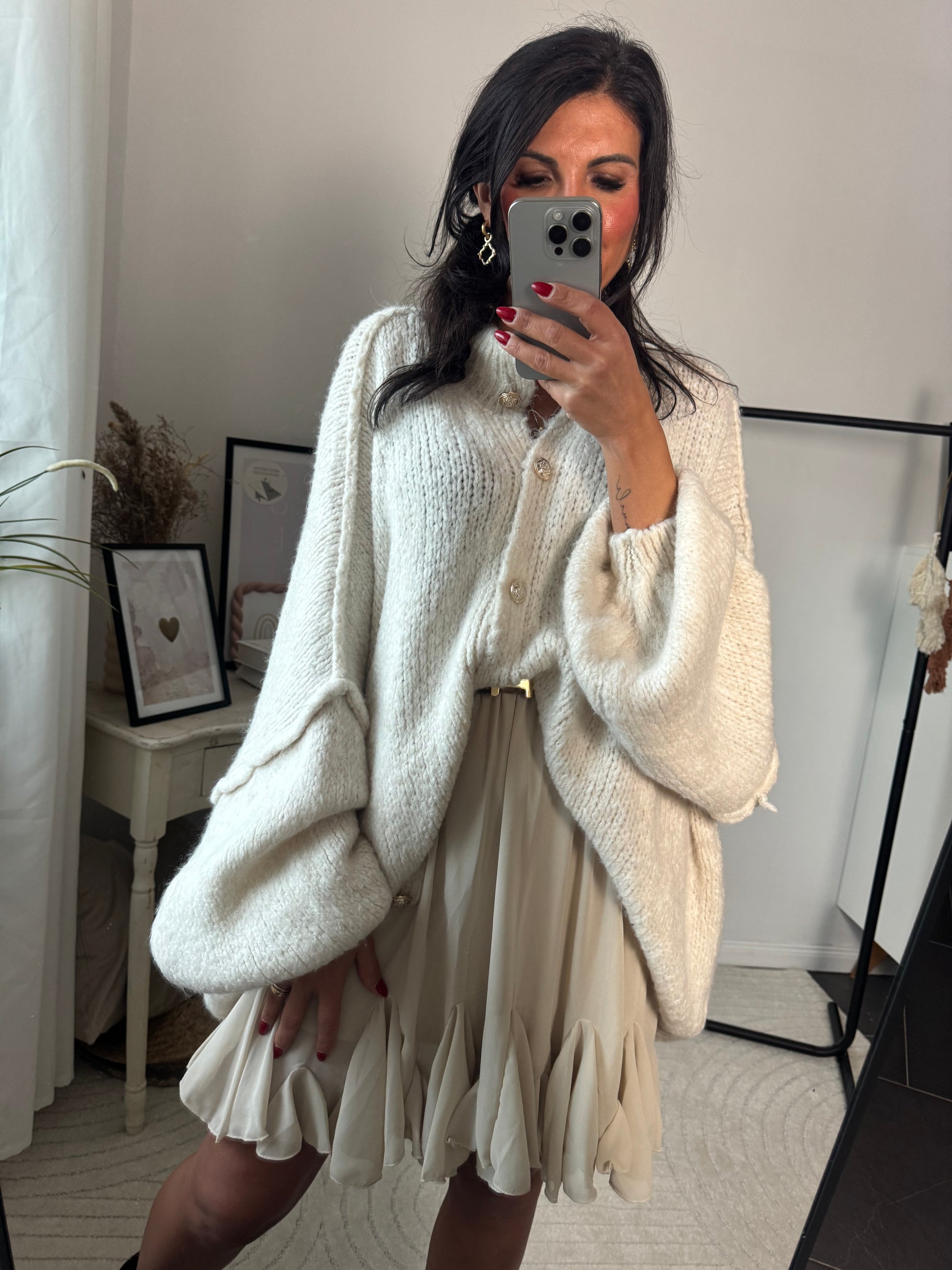 Kuscheliger Oversize-Cardigan in wunderschönen Creme Ton mit edlen goldenen Knöpfen. Der grob gestrickte Stoff sorgt für ein weiches, gemütliches Tragegefühl, während der lockere Schnitt perfekt für den entspannten, aber eleganten Look ist – ob zu Kleid, Rock oder Jeans✨