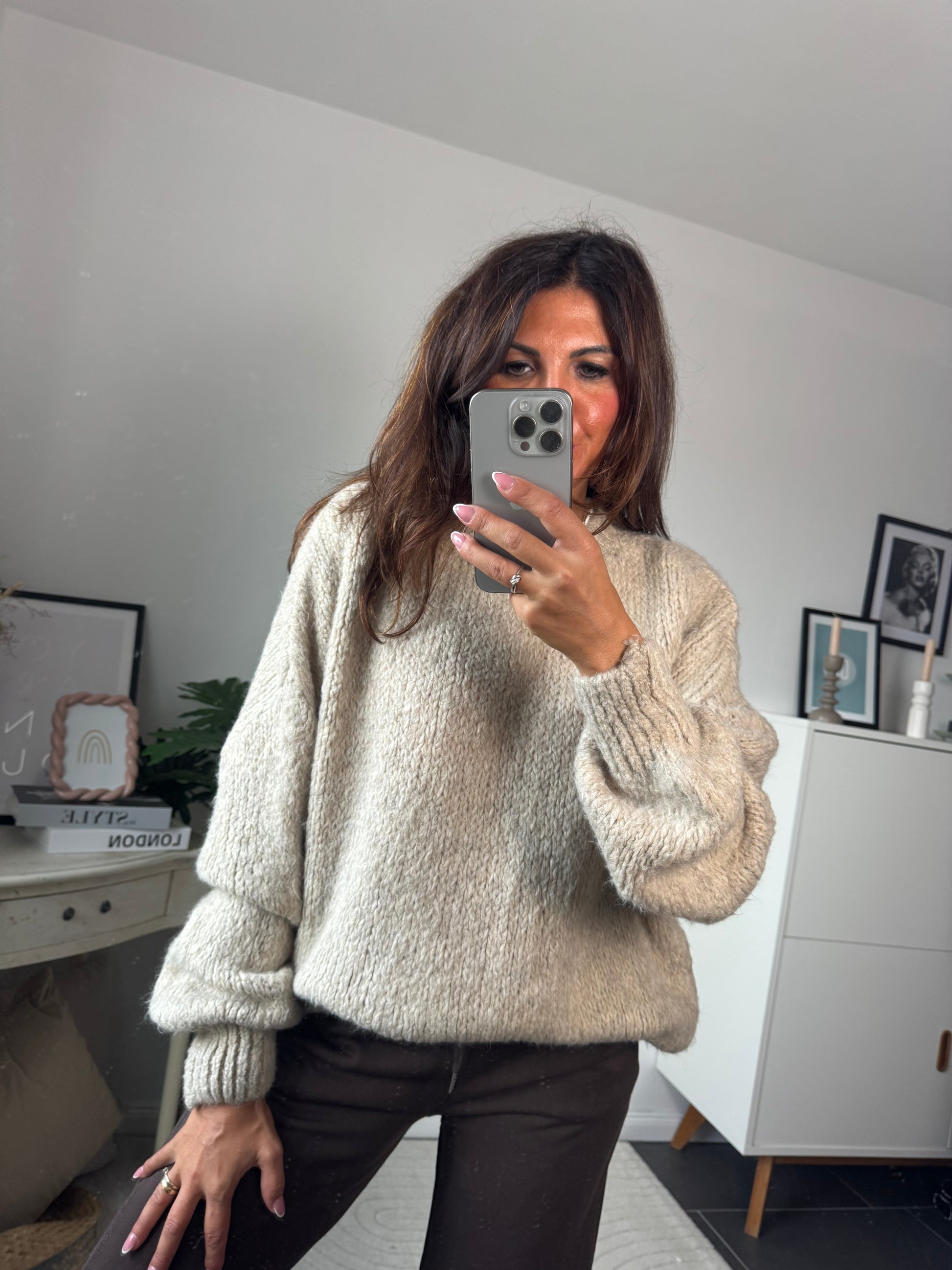 Der Pullover ist ein kuscheliger Strickpulli in warmen Beigeton – und hier in der kurzen Version. Locker geschnitten, mit weiten Ärmeln und breiten Bündchen, sorgt er für einen frischen, modernen und zugleich gemütlichen Look✨