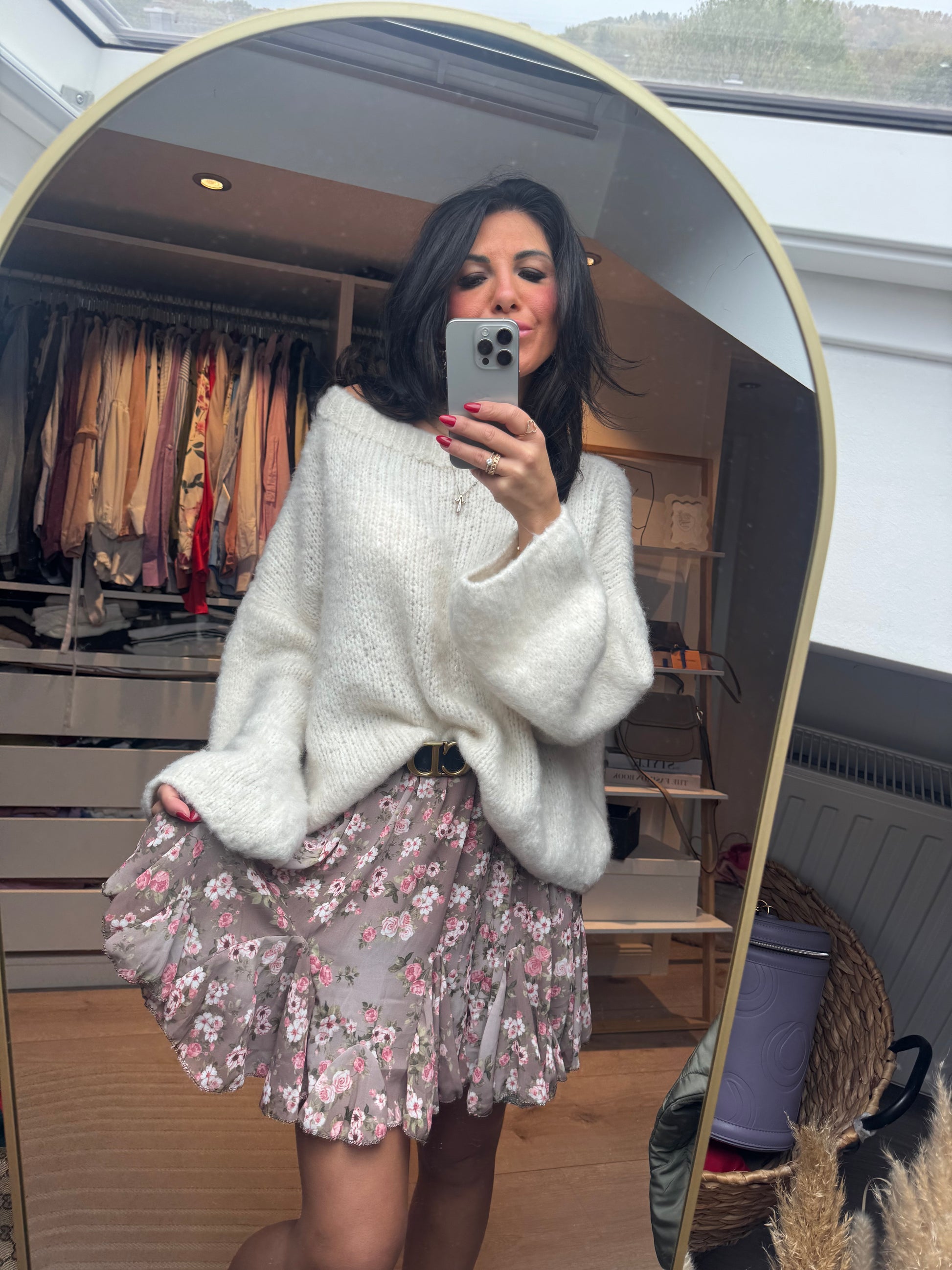 Kuschelweicher, oversized geschnittener Strickpullover in Offwhite mit weitem Rundhalsausschnitt und extra langen Ärmeln. Der lockere Schnitt sorgt für einen lässigen, gemütlichen Look – perfekt zum Hineinkuscheln. Kombiniert mit einem Rock oder Jeans wirkt er feminin und modern zugleich✨