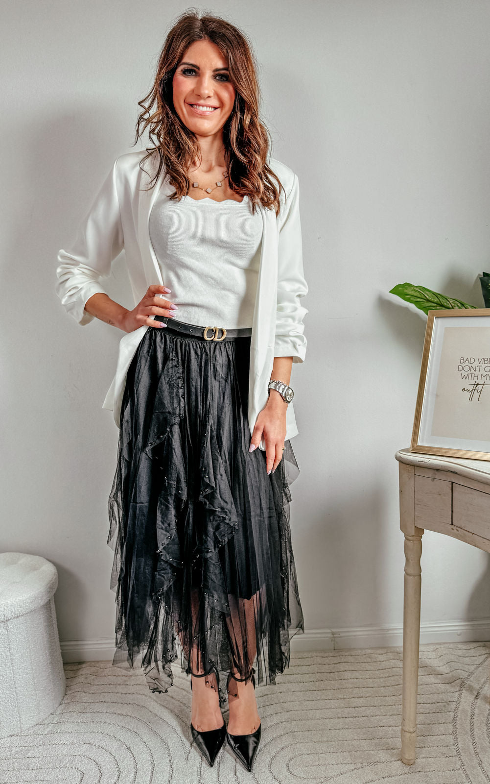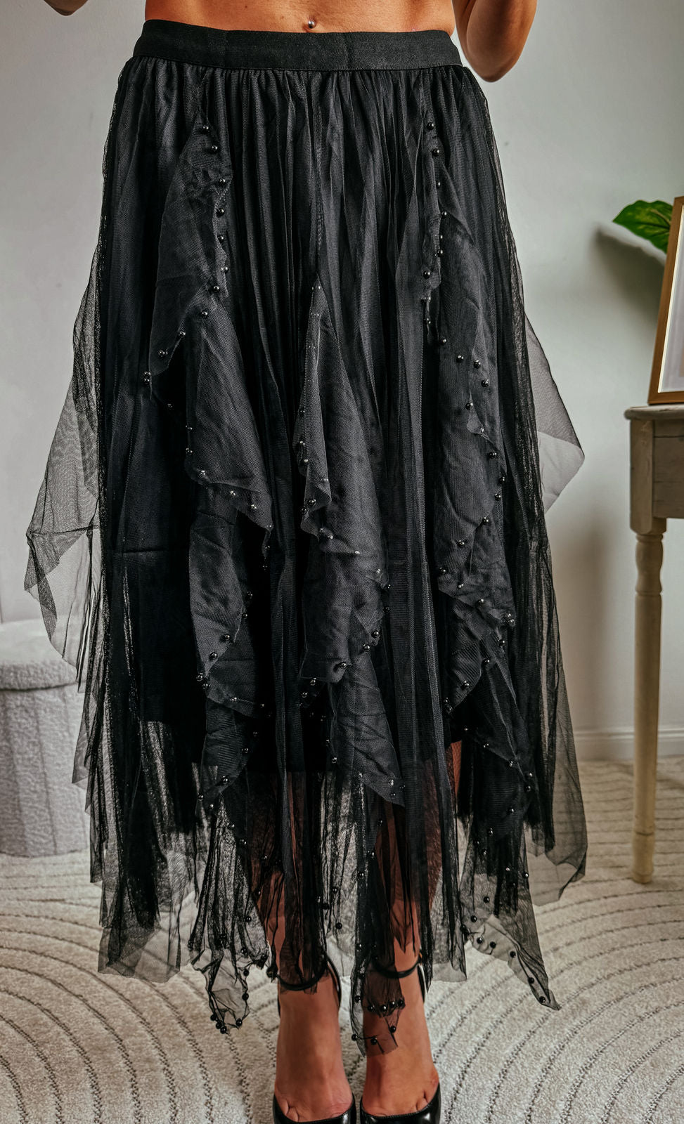 Dieser wunderschöne plissierte Tüllrock mit Perlendetails kann sowohl elegant als auch sportlich getragen werden. Mit Pumps ist er ein echter Hingucker und perfekt für den nächsten besonderen Anlass ✨