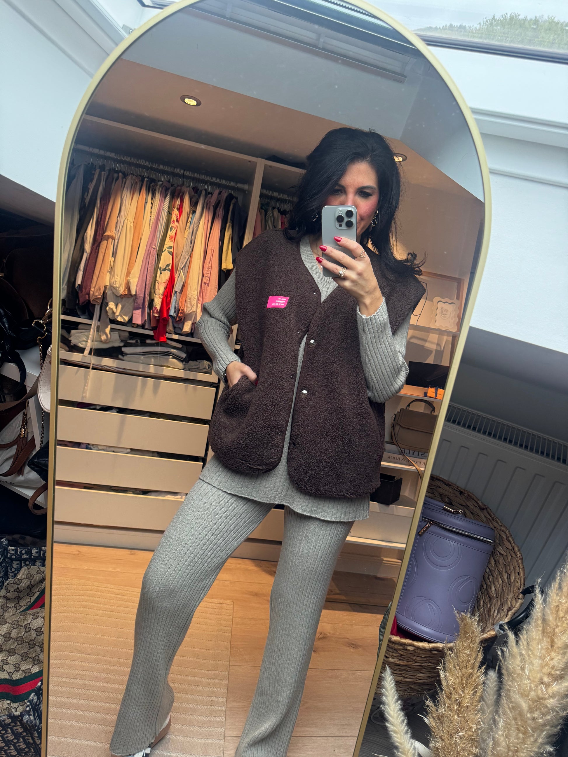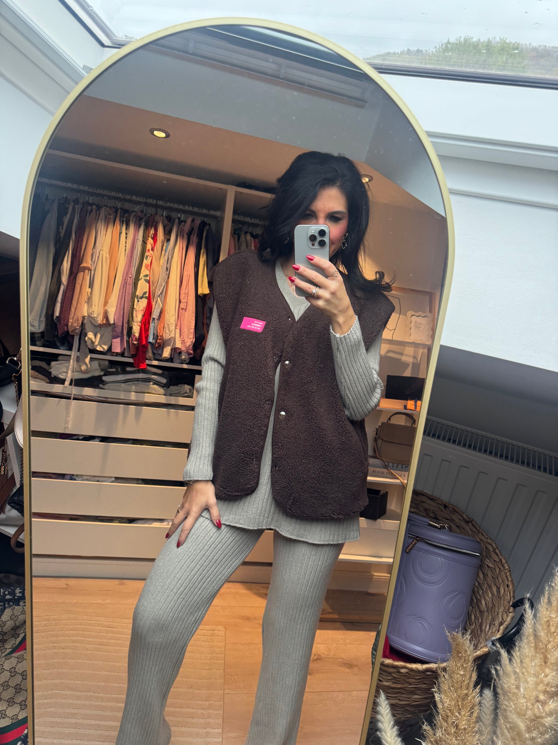 Die Weste ist eine kuschelige Teddy-Weste in Schokobraun. Sie hat eine flauschige Struktur, seitliche Eingrifftaschen und wird vorne mit kleinen Druckknöpfen geschlossen. Der Schnitt ist locker und gerade, wodurch sie sich perfekt über Strick, Blusen oder Kleider tragen lässt. Durch den neutralen Farbton ist sie vielseitig kombinierbar und sorgt für einen gemütlich-lässigen Look mit einem Hauch von Eleganz✨