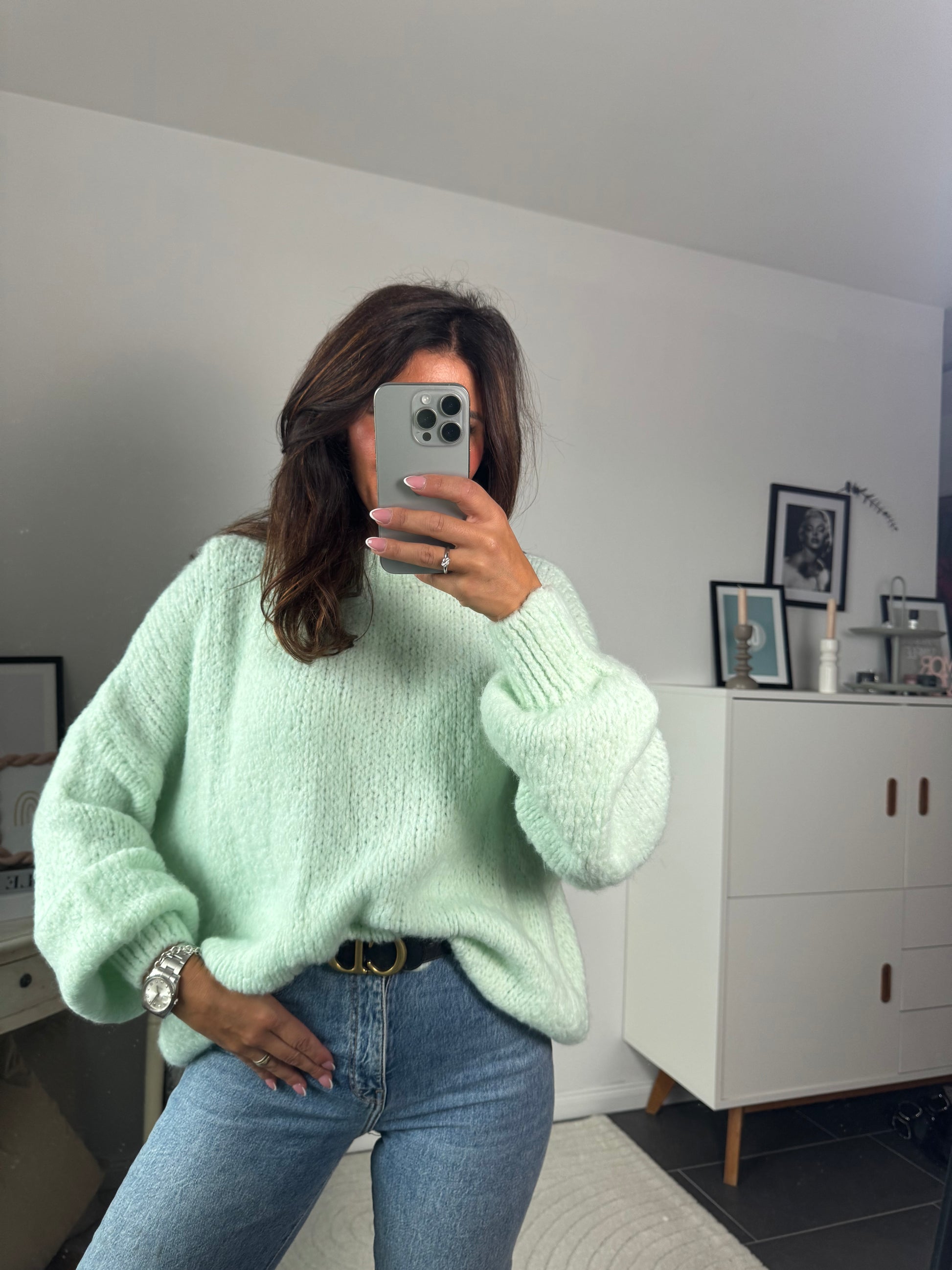 Der Pullover ist ein kuscheliger Strickpulli in sanftem Mintgrün – und hier in der kurzen Version. Locker geschnitten, mit weiten Ärmeln und breiten Bündchen, sorgt er für einen frischen, modernen und zugleich gemütlichen Look✨