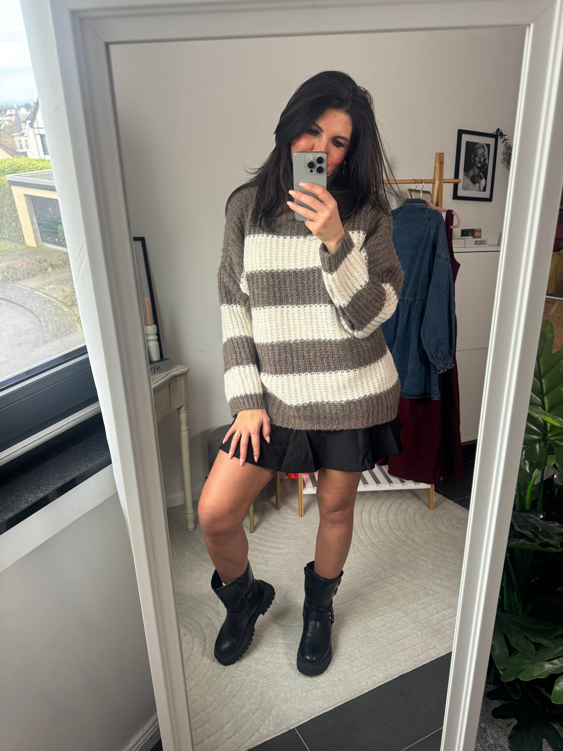 Lässiger Oversize-Strickpulli mit breiten Streifen in warmem Braun und Creme. Weicher, grob gestrickter Look mit gemütlichem Tragegefühl. Locker geschnitten mit entspannten Ärmeln und klassischem Rundhalsausschnitt – perfekt für einen cozy, modernen Alltagsstyle. Vielseitig kombinierbar zu Röcken, Jeans oder Lederleggings und ideal für entspannte Herbst- und Winterlooks✨🌸