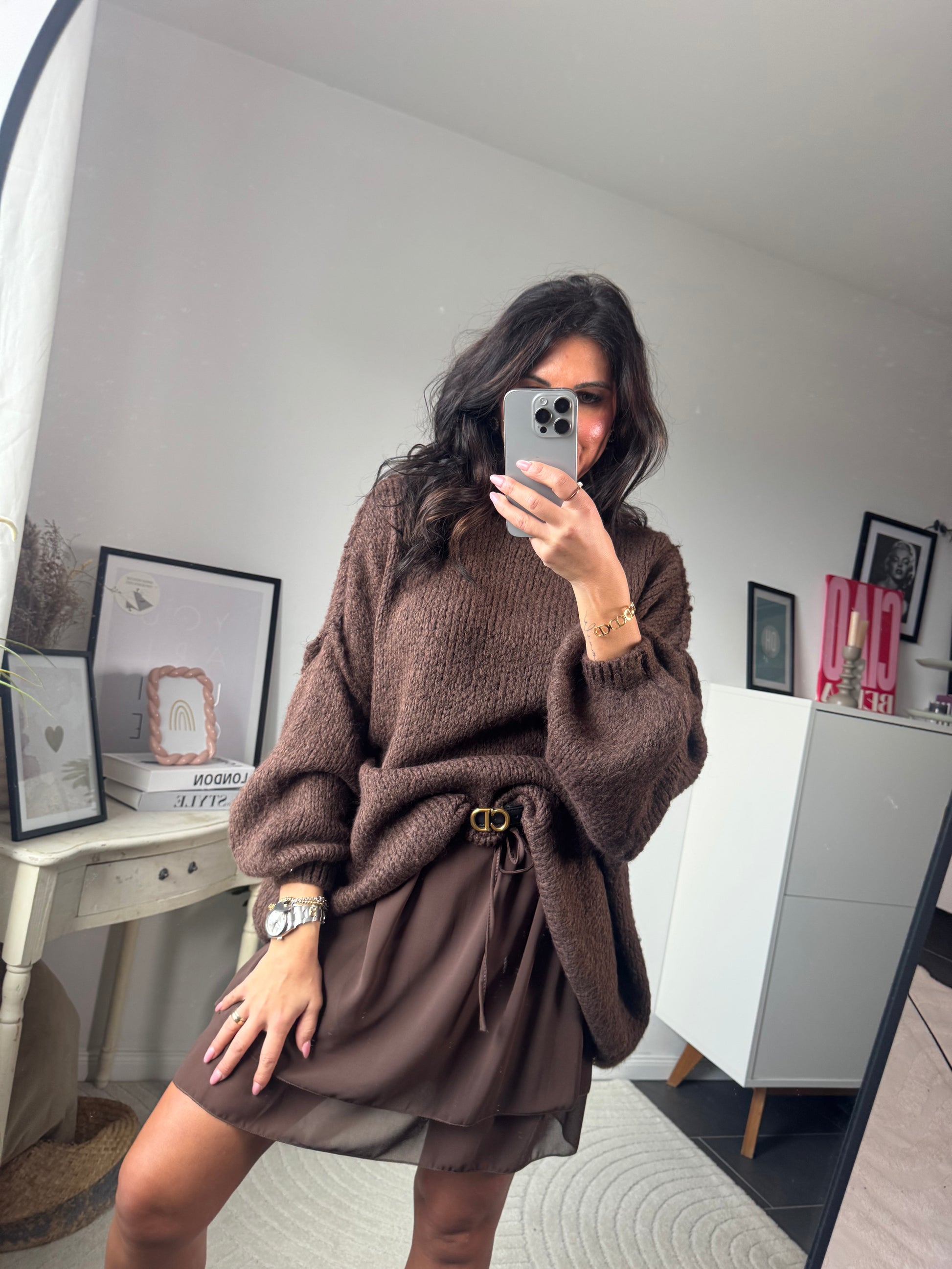 Der Pulli ist weich, kuschelig und hat diesen typisch lässigen Oversize-Look. Die Ärmel sind weit geschnitten und fallen locker, was dem ganzen Outfit eine schöne, gemütliche Form gibt. Der Strick wirkt warm und strukturiert, perfekt für kühle Tage. Du kannst ihn lässig über Röcke oder Jeans tragen – er macht jedes Outfit sofort cozy und stylish✨