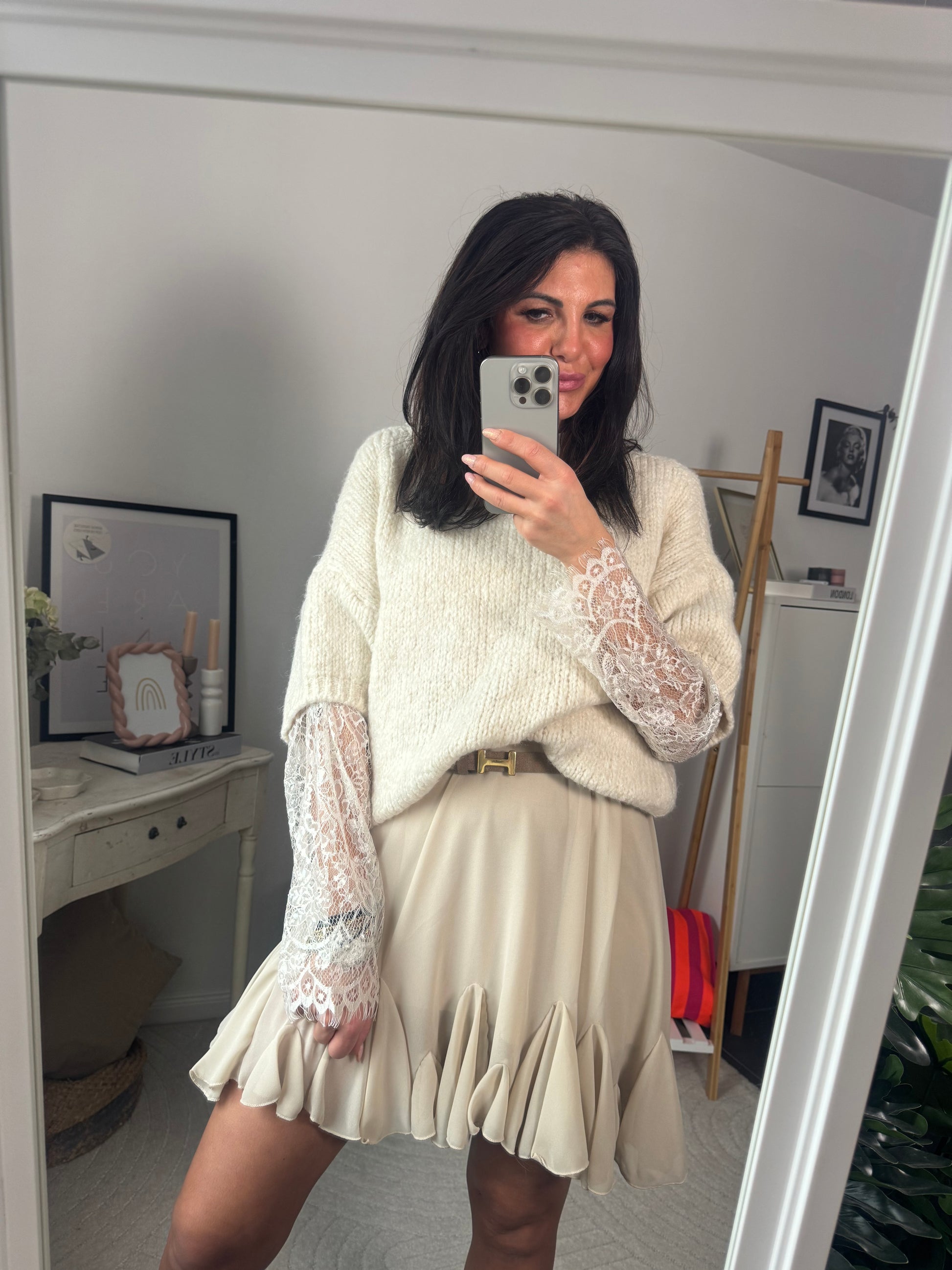 Edler Strickpulli in zartem Cremeweiß mit weichem, hochwertigem Griff. Locker geschnitten mit femininem Fall und besonderen Spitzenärmeln, die dem Look eine elegante und gleichzeitig verspielte Note verleihen. Die feine Spitze sorgt für einen stilvollen Kontrast zum cozy Strick und macht den Pulli perfekt für besondere Alltagsmomente oder schicke Anlässe. Lässt sich wunderschön zu Röcken, Stoffhosen oder Jeans kombinieren✨