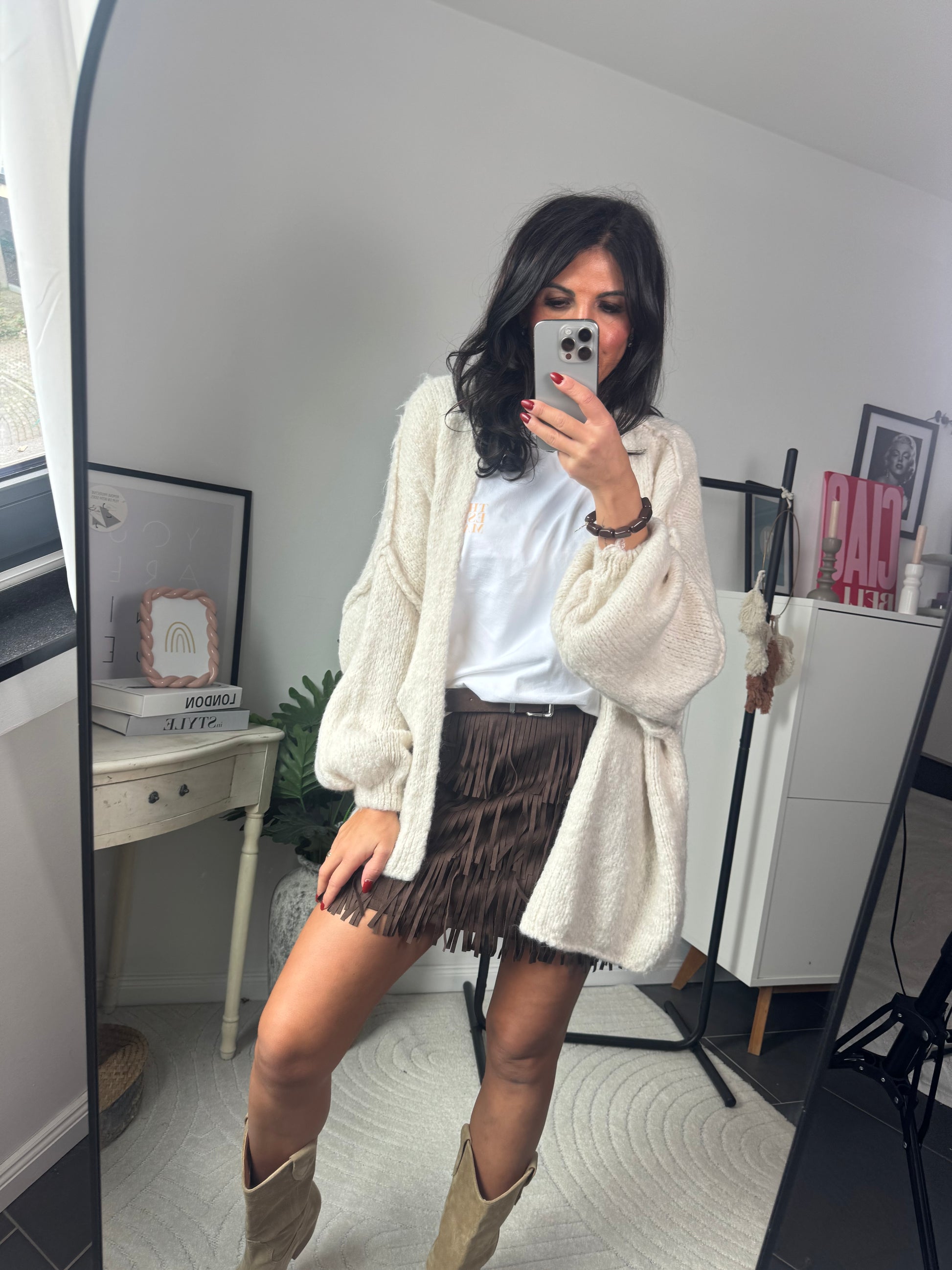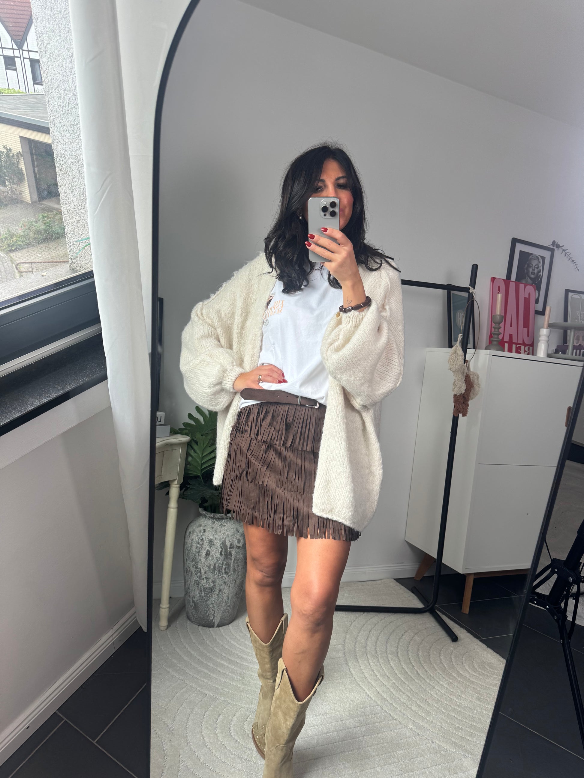 Kurzer Wildlederrock in warmem Schokobraun mit verspielten Fransen – ein echter Eyecatcher für Boho-Liebhaberinnen. Das weiche Veloursmaterial sorgt für einen angenehmen Tragekomfort, während die mehrlagigen Fransen dem Look Bewegung und Charakter verleihen. Perfekt kombiniert mit Strick, Boots oder einer weißen Bluse für einen lässig-stylischen Herbst-Vibe✨