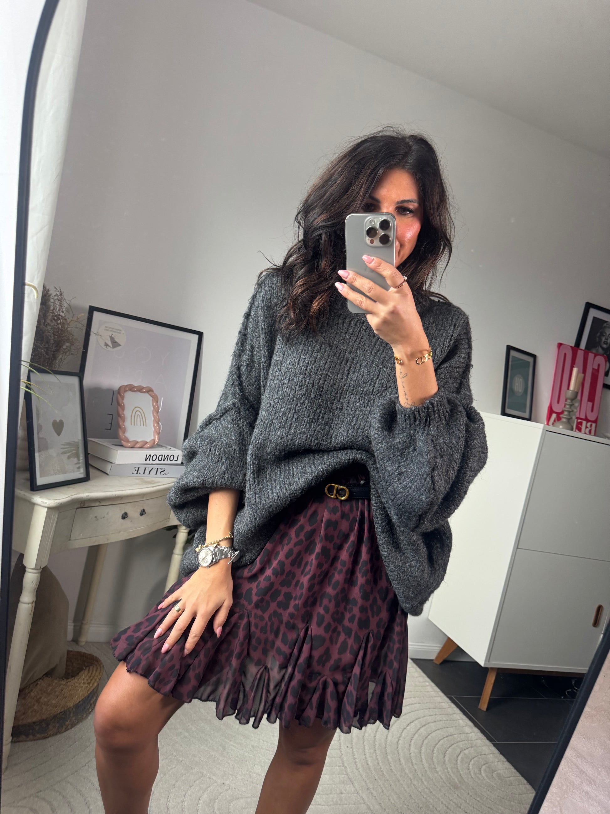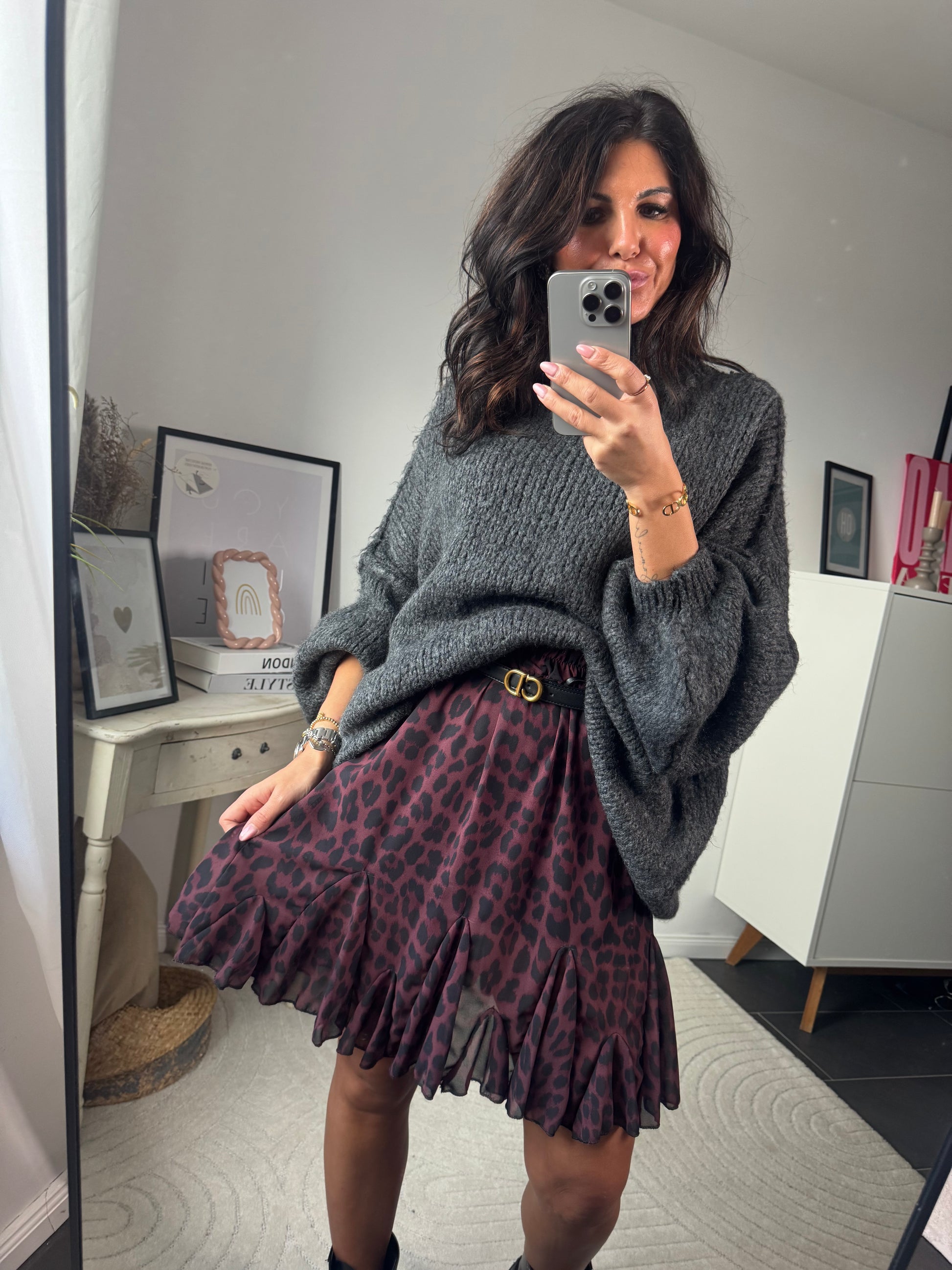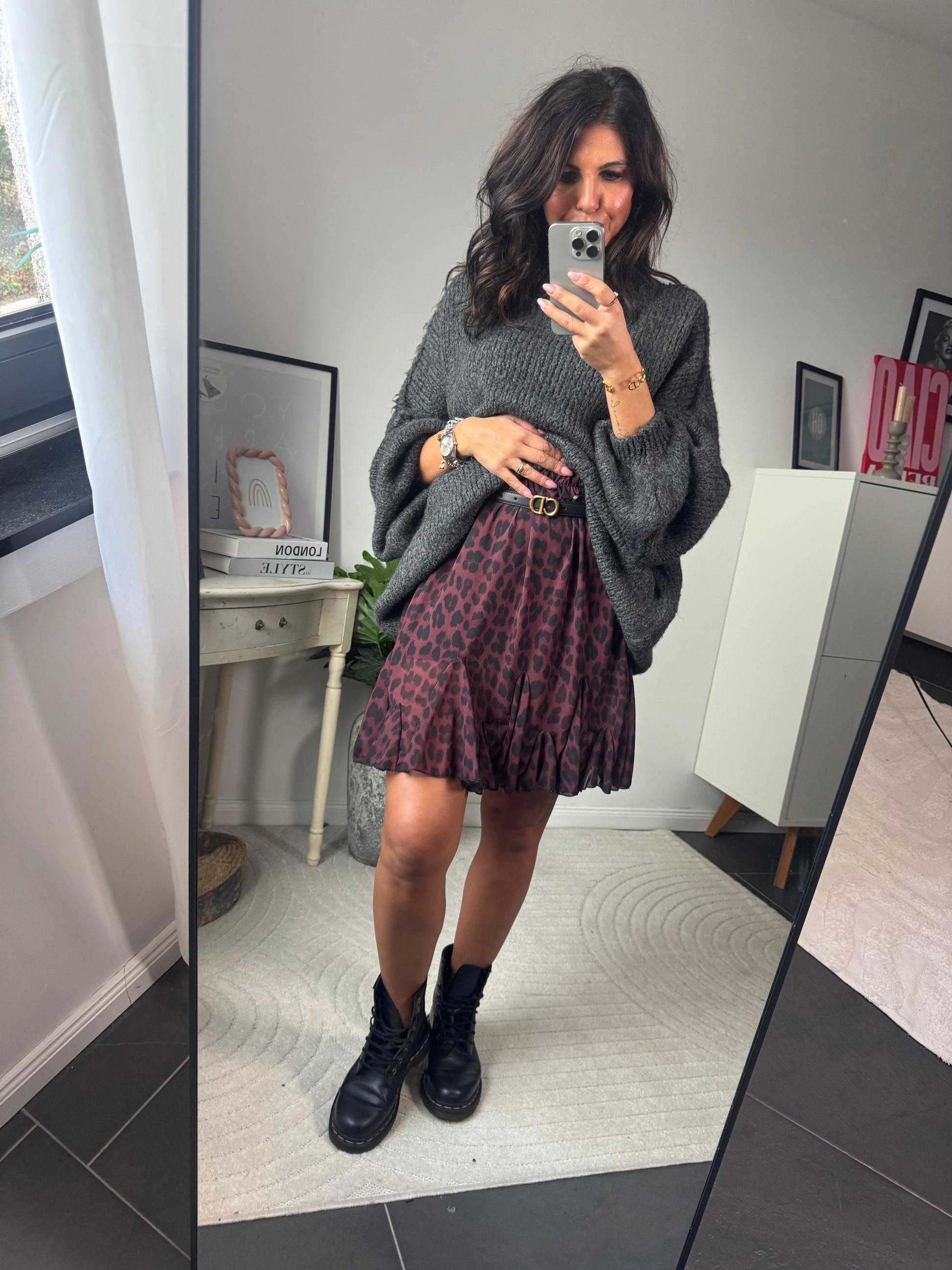 Der Rock hat ein fließendes, leicht plissiertes Design mit einem dunkelroten Leo-Muster, das sofort ins Auge fällt. Er wirkt verspielt, modern und lässt sich super mit Strick, Boots oder Sneakern kombinieren. Der elastische Bund sorgt für einen bequemen Sitz und eine schöne Silhouette🐆
