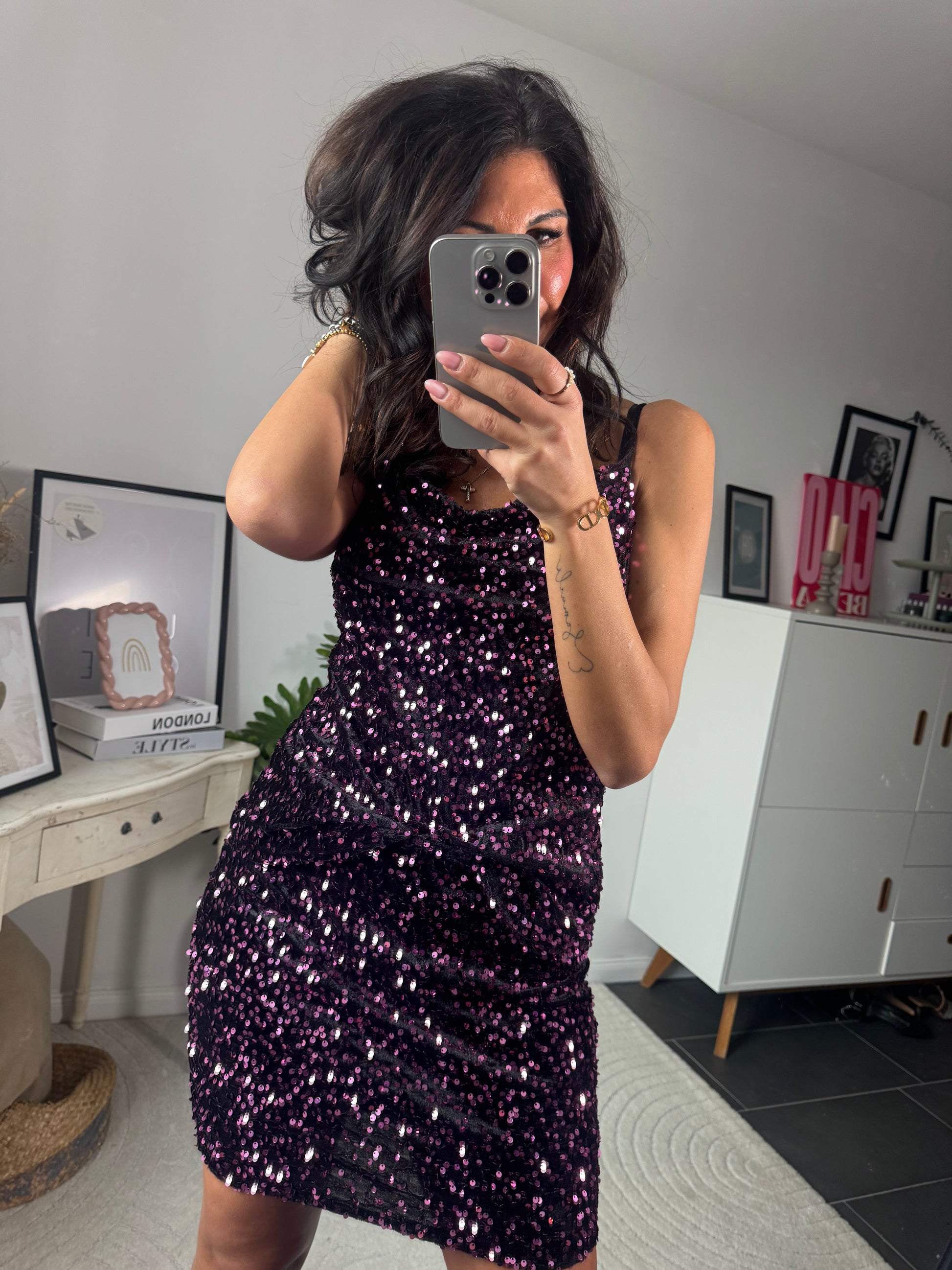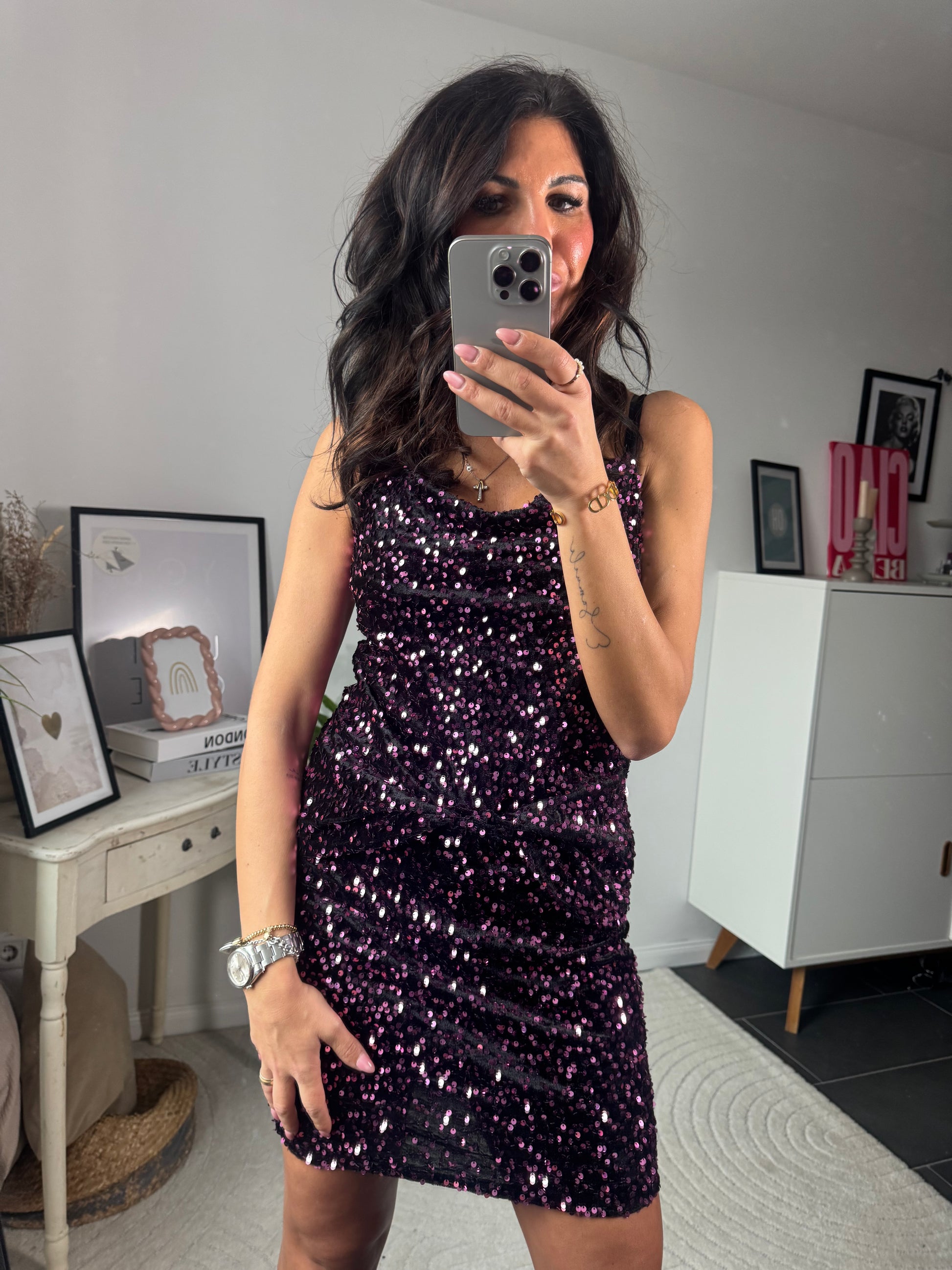 Der Rock ist komplett mit funkelnden Pailletten besetzt und sitzt eng anliegend, ohne zu drücken. Innen ist eine kurze, weiche Shorts eingenäht – damit hast du perfekten Halt, nichts verrutscht und du kannst dich frei bewegen. Ideal für Partys, Dinner oder besondere Nächte voller Glitzer✨