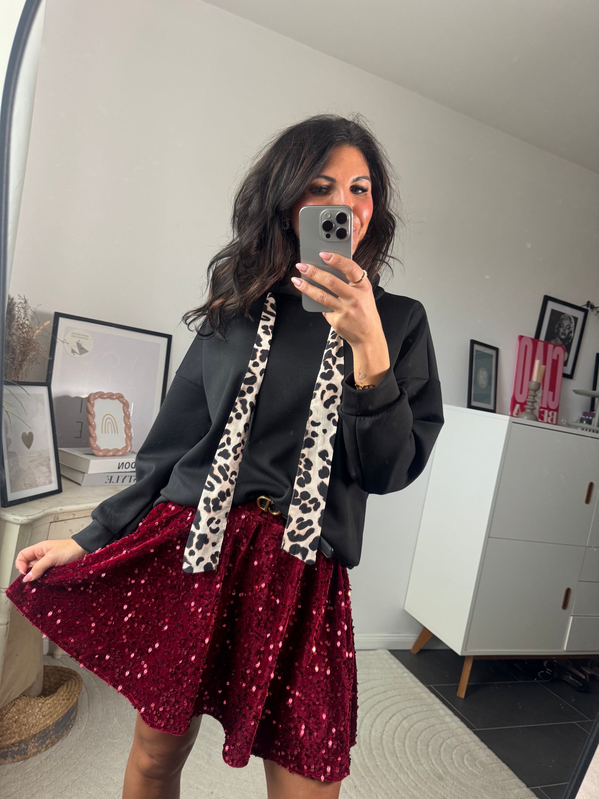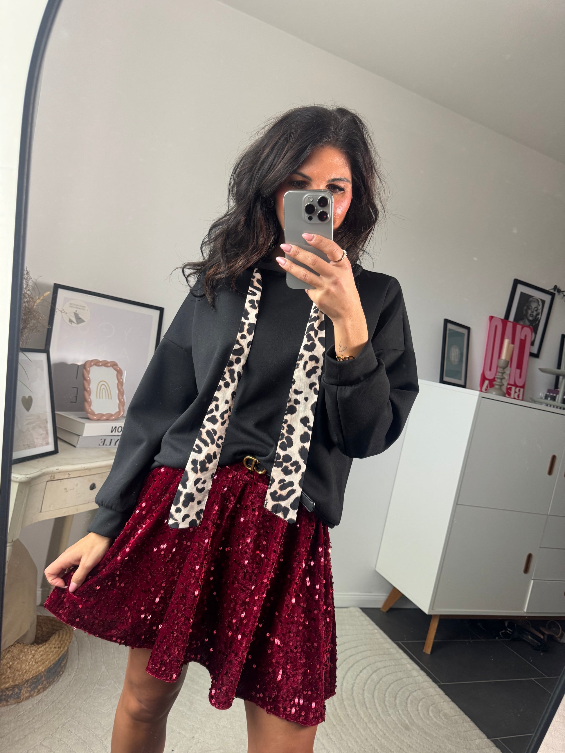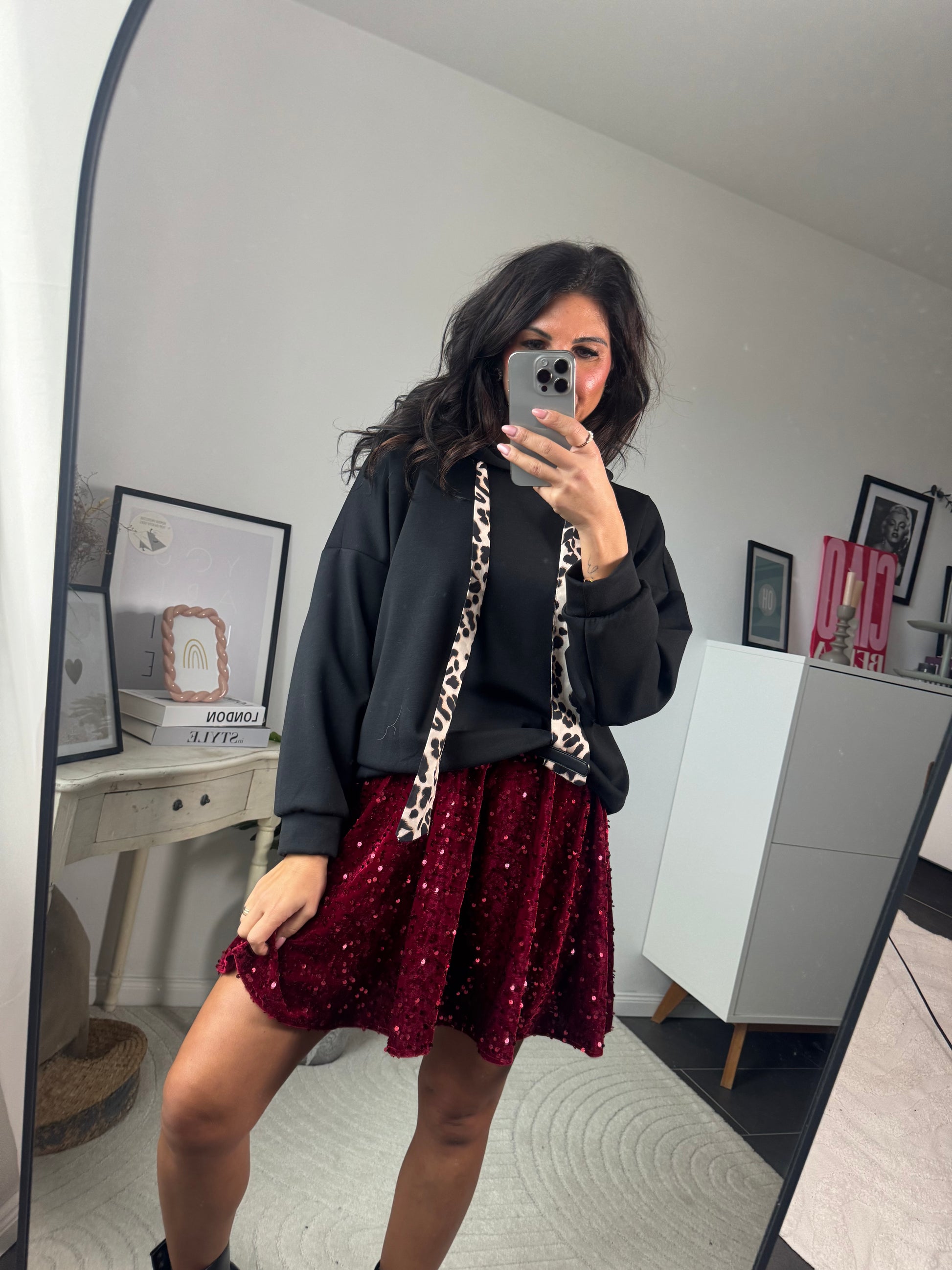 Der Rock ist aus einem weichen, elastischen Stoff gefertigt und komplett mit roten Pailetten besetzt , die bei jeder Bewegung dezent funkeln. Durch den ausgestellten Schnitt fällt er locker und leicht – perfekt, wenn du etwas Glitzer willst, aber trotzdem bequem bleiben möchtest. Mit Gürtel kannst du die Taille schön betonen und den Look noch eleganter machen✨