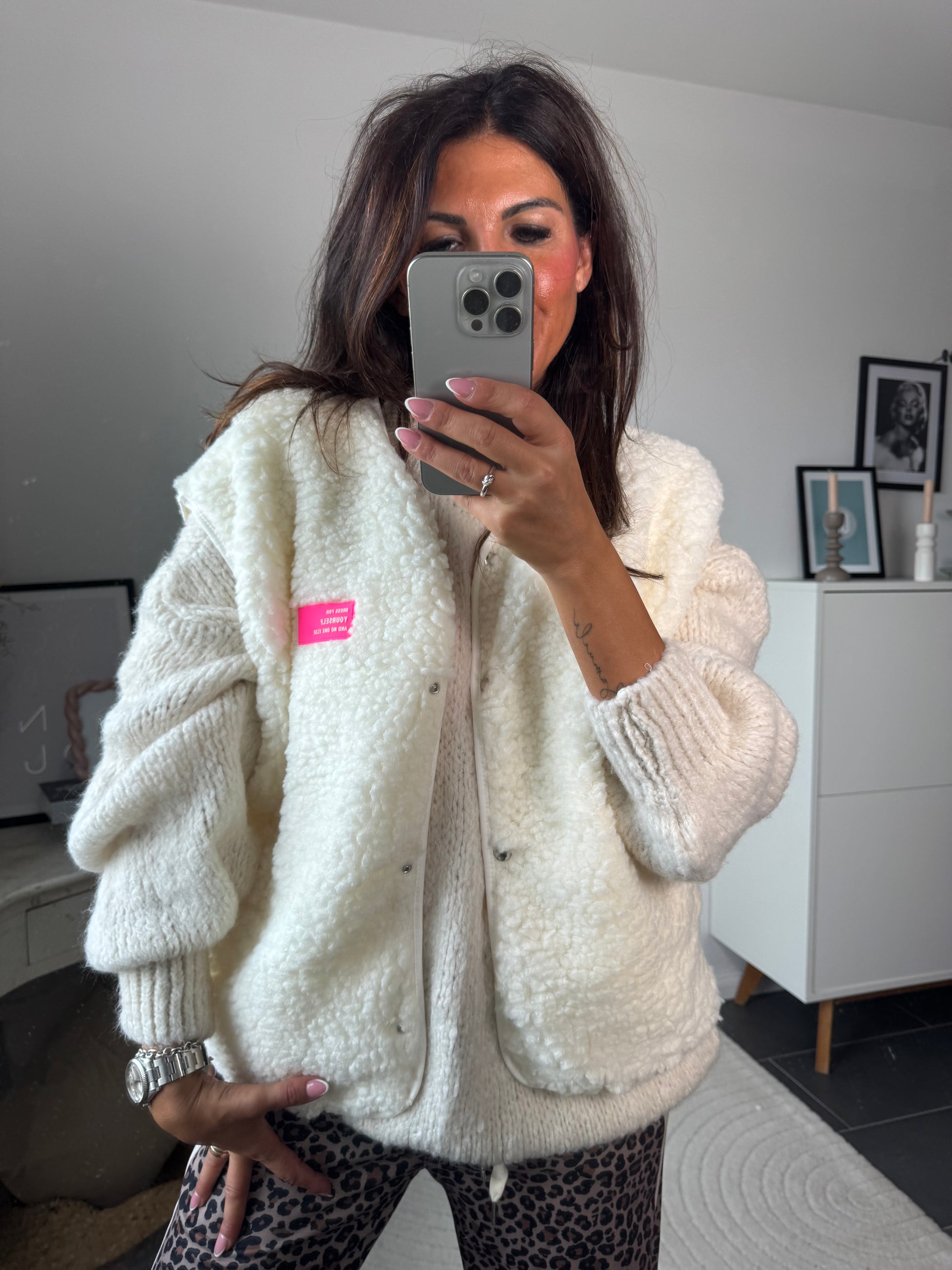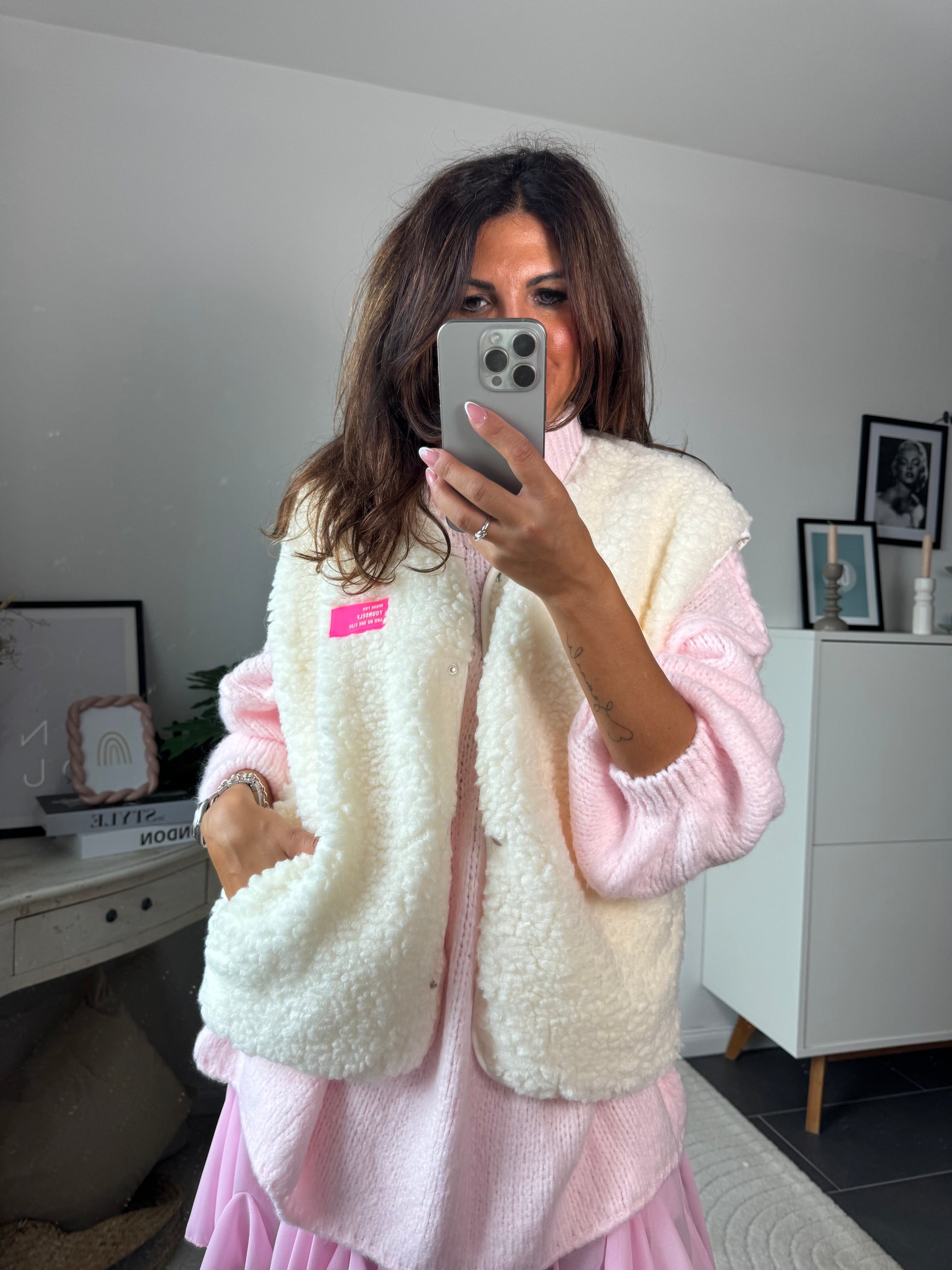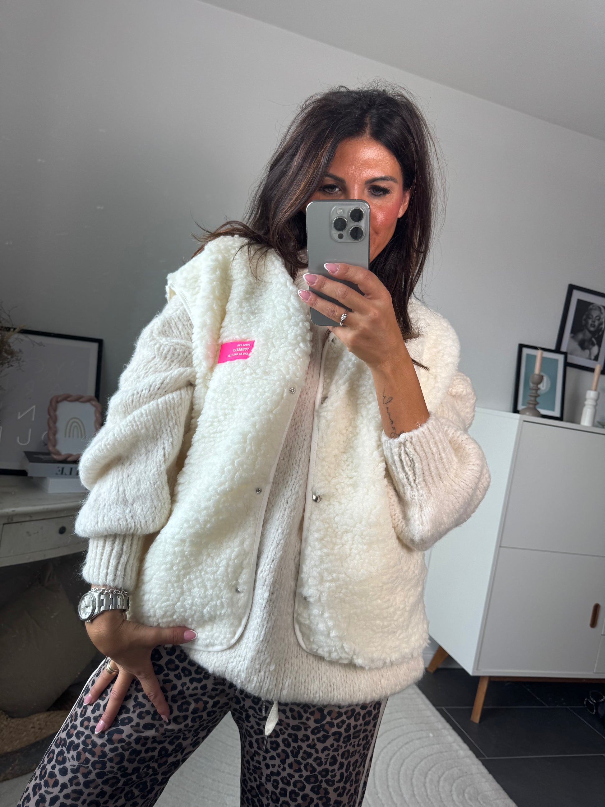 Die Weste ist eine kuschelige Teddy-Weste in Cremeweiß. Sie hat eine flauschige Struktur, seitliche Eingrifftaschen und wird vorne mit kleinen Druckknöpfen geschlossen. Der Schnitt ist locker und gerade, wodurch sie sich perfekt über Strick, Blusen oder Kleider tragen lässt. Durch den neutralen Farbton ist sie vielseitig kombinierbar und sorgt für einen gemütlich-lässigen Look mit einem Hauch von Eleganz✨